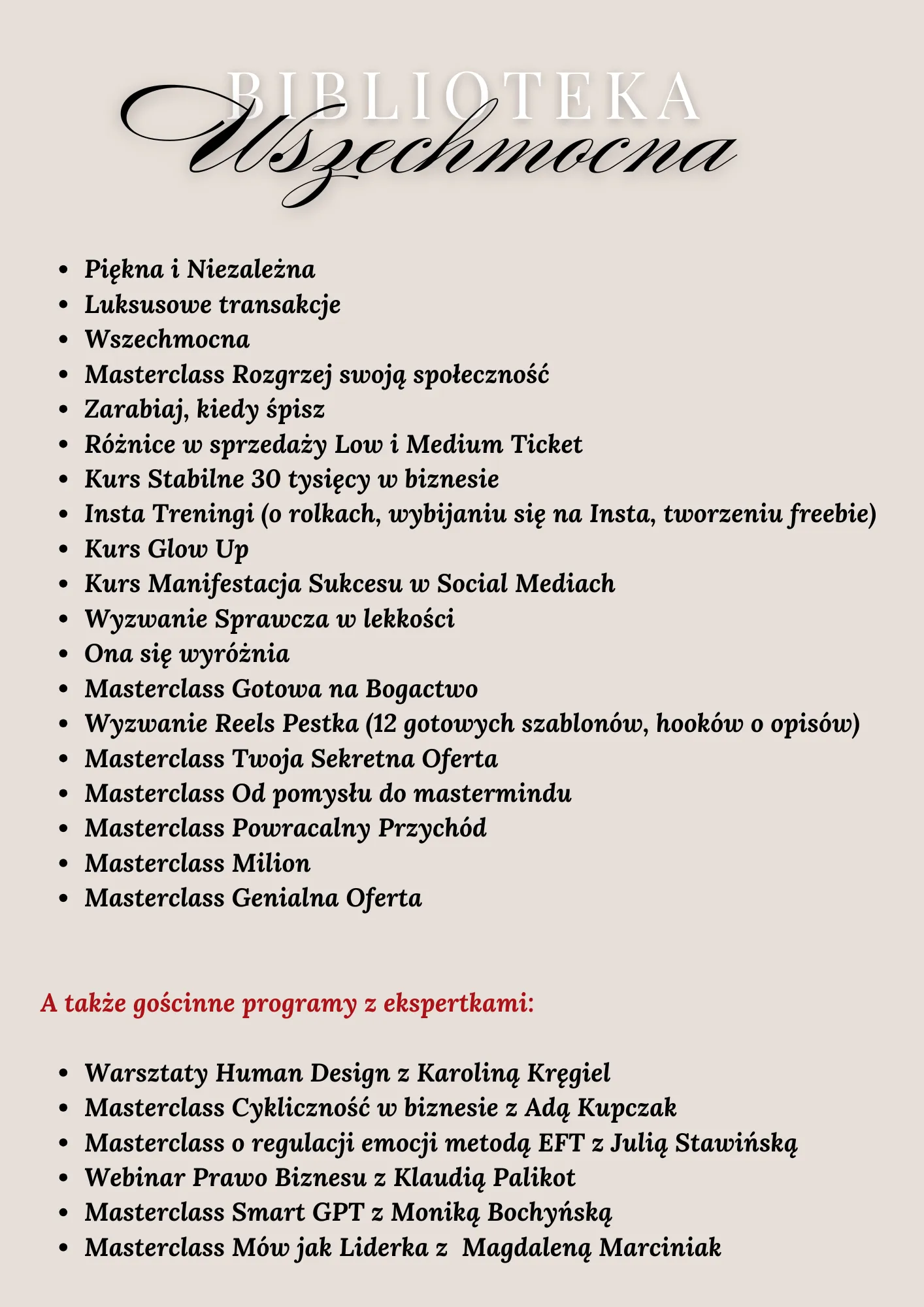 Na start odblokowujesz dostęp do moich programów o wartości 40 000 zł – tych które znajdują się w Bibliotece Wszechmocnej oraz całego menu. To dopiero początek!